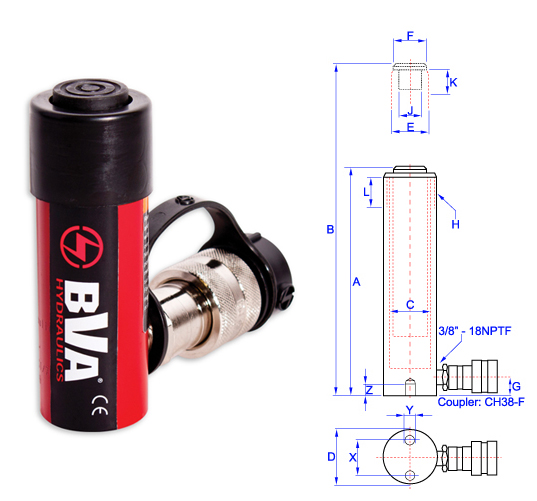 C (boring)=29 mm, D=38 mm, E=25 mm, F=25 mm, G=20 mm, H=1.1/2-16UN, L=28mm, J=3/4"-16UNF, K16mm, X=25, Y=1/4"-20UNC Z= 14 mm