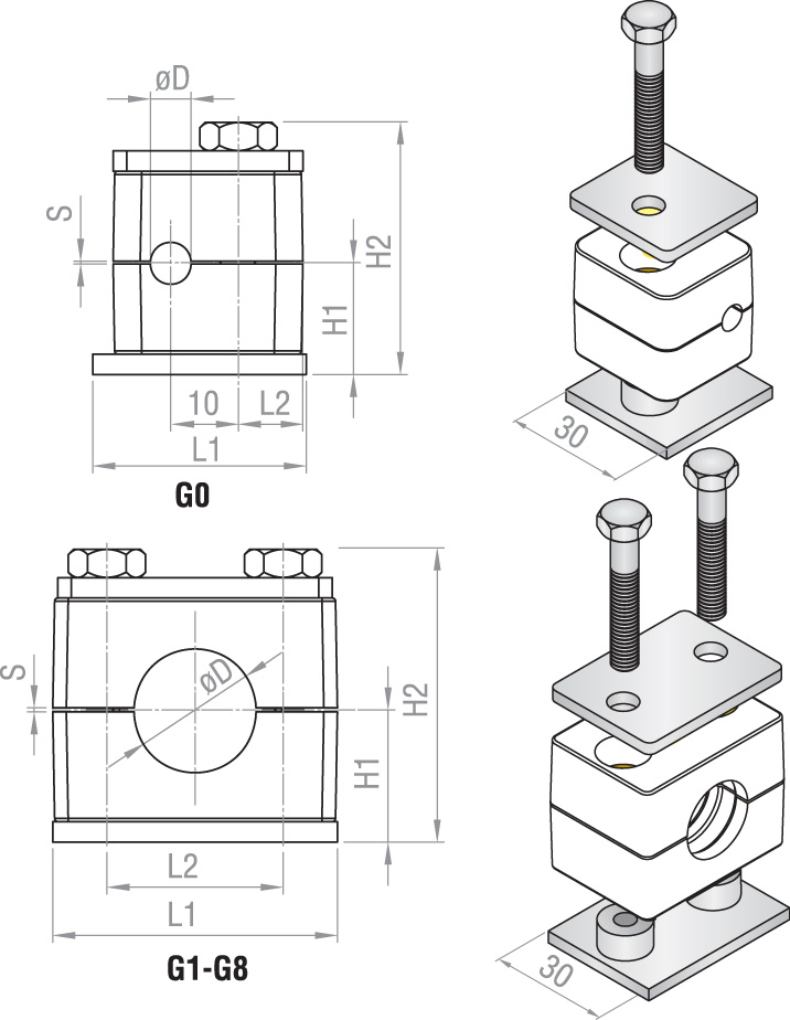 Uitvoering: complete beugelset met zeskantbout(en), bovenplaat en lasplaat.