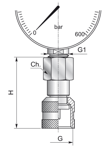 Systeemaansluiting: Manometer BSP binnendraad (op aanvraag met demping), afdichting: O-ring.