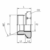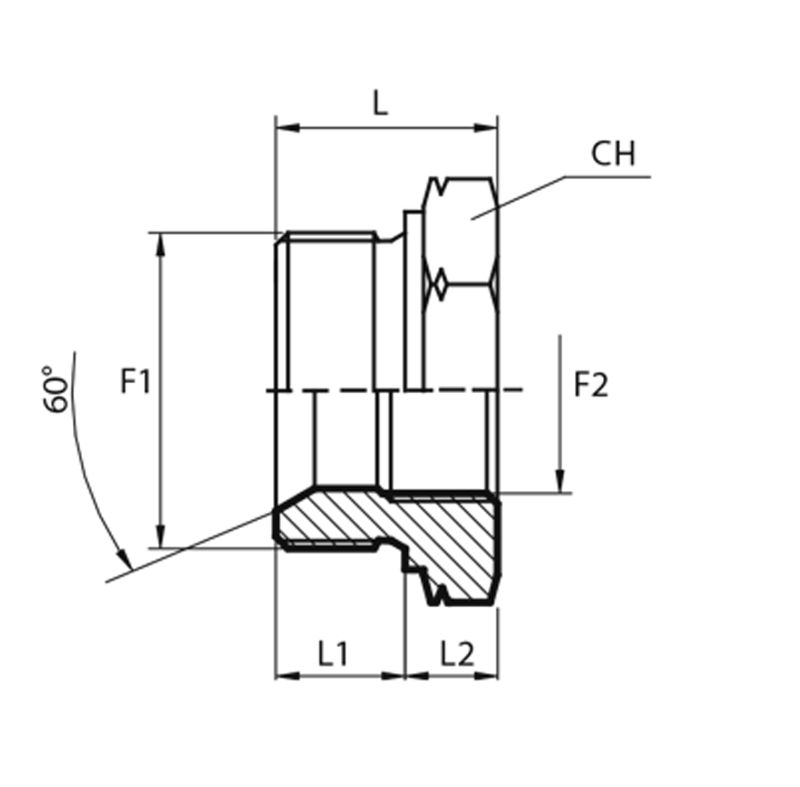 Aansluiting F1: Metrische buitendraad, afdichting: 60° conus.