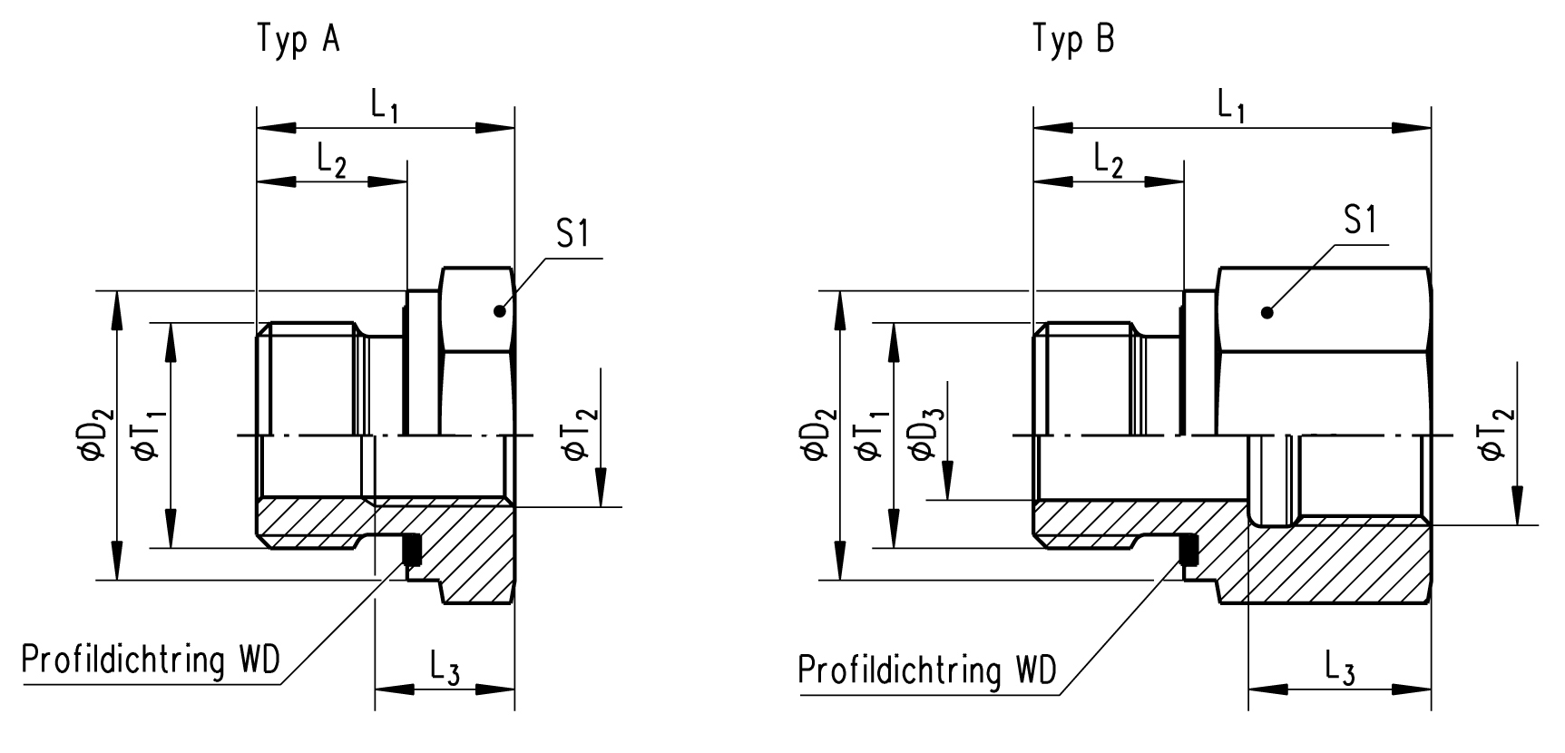 Uitvoering: Schroefdraadverloop BSPP male – elastische afdichting WD (ISO 1179) / BSPP female (ISO 1179-1).